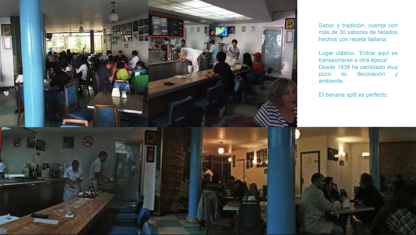 Se fotografiaron diferentes heladerías y neverías (famosas, tradicionales y posicionadas en el mercado) para examinar el contexto, el servicio, los productos, las ofertas, los diferentes conceptos y la forma del lugar, así como sus muebles y la forma de acomodarlos.