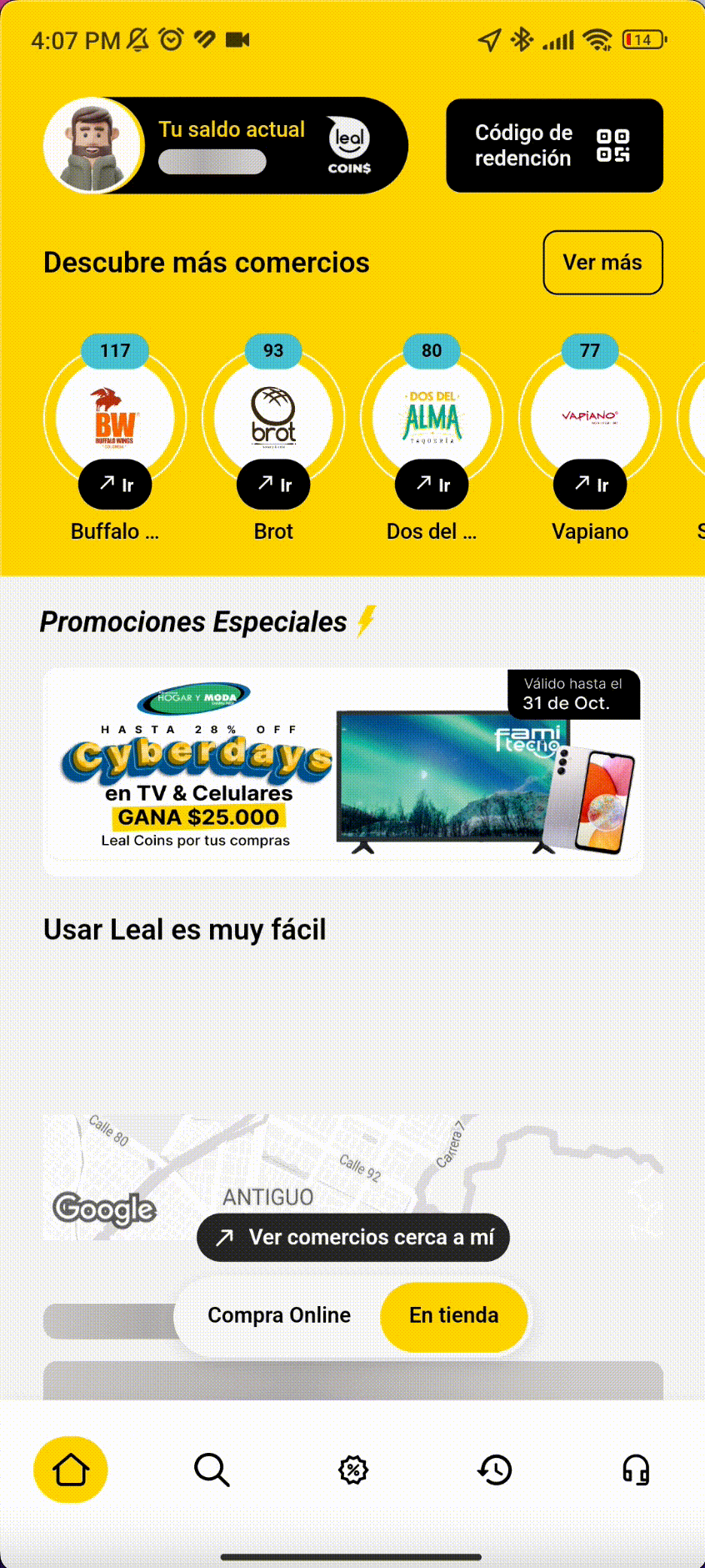 En tienda: Destacamos comercios con puntos, un mapa de ubicaciones cercanas y puntos por vencer. Estas acciones se posicionaron estratégicamente dentro de la pantalla inicial para garantizar su relevancia y visibilidad.